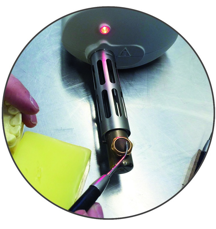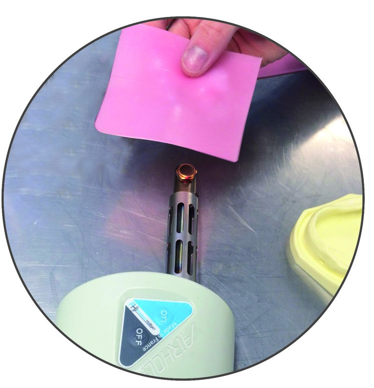 4- Ajuster le manomètre à 0,5 bar de pression.Passer la plaque de cire à 3 cm au-dessus de la buse avec des mouvements lents, pour une chauffe uniforme. Poser l'instrument directement sur la buse pour une chauffe rapide.